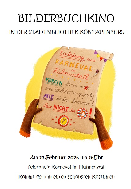 Wir laden ein zum Bilderbuchkino "Karneval im Hühnerstall" am 11.02.2026 um 16.00 Uhr. Kommt gerne in euren schönsten Kostümen! Wir freuen uns auf euch!